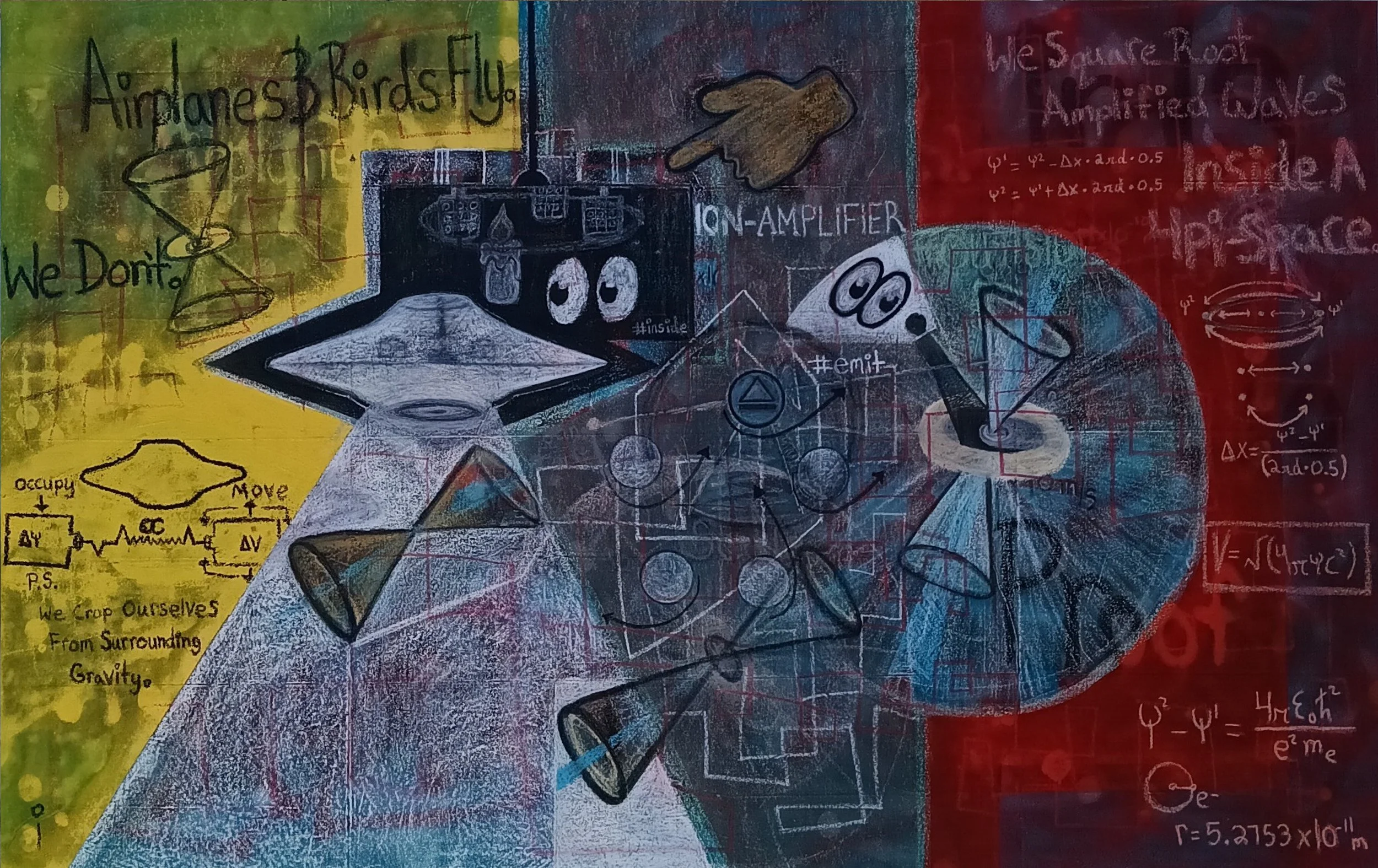 2024 | Title: Phenomena - Mixed media painting expressing Vasquez’s equations of gravity and explores his deepest thoughts on extraterrestrial space vehicles. The painting conceptualizes Danny’s perspective of “UFOs” and extraterrestrial beings adopting the ionization process of black holes for advance aeronautics. Danny made this painting to give clarity on the UFO subject and to bring awareness that people have a common misconception of what it means to be flying. Hence, “Airplanes & Birds Fly. We Don’t.”.